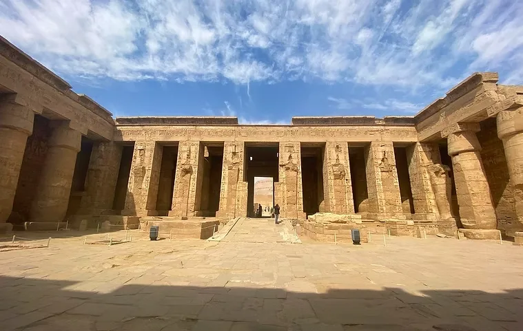 Denderah Temple of Hathor: we spend a whole day in this most beautiful temple dedicated to Hathor, the Goddess of Love. We enter through green gardens, into the courtyard, and the Mamisi which is the oldest part of the temple. The presence of Hathor permeates the great hypostyle hall, which is home to the famous rectangular zodiacs, and the stunning blue murals created under Greek rule of Egypt. Our guide is from Denderah, and he will show us all the sacred and important parts of the temple, including the underground crypts where the Denderah lightbulbs can be seen. We will go to the power places of Hathor, and the group will receive activations and blessings. We will visit the chamber of the resurrection of Osiris, the Denderah Zodiac, and the high roof where a panoramic view of the landscape can be seen. We will also explore the grounds, and see the swimming pool of Cleopatra, and the Nilometer.